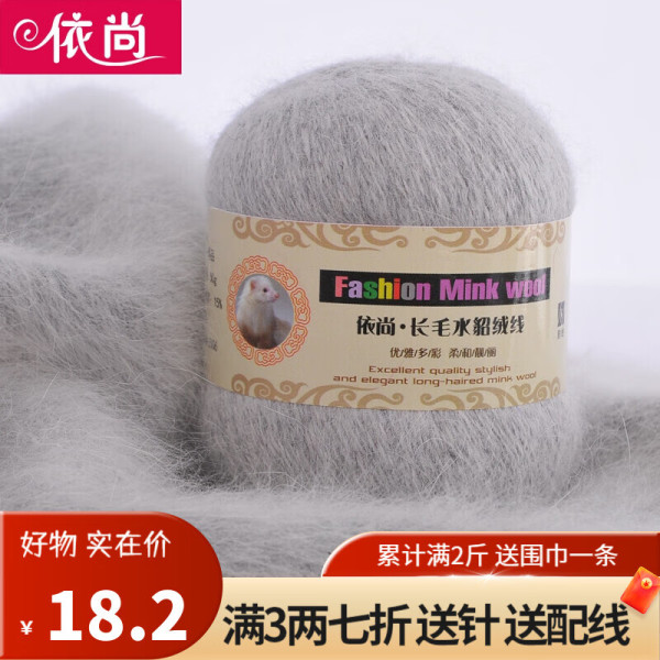 依尚 长毛水貂绒毛线羊绒线 围巾毛线团粗毛线编织婴儿用毛线球手编中粗可机织6+6 浅灰色