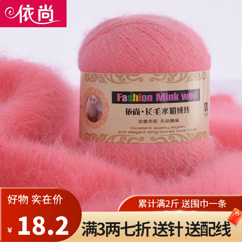 依尚长毛水貂绒毛线羊绒线围巾毛线团粗毛线编织婴儿用毛线球手编中粗 西瓜红