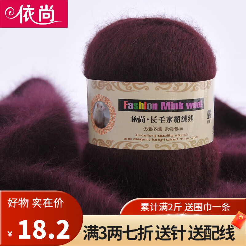 依尚长毛水貂绒毛线羊绒线围巾毛线团粗毛线编织婴儿用毛线球手编中粗 红咖啡