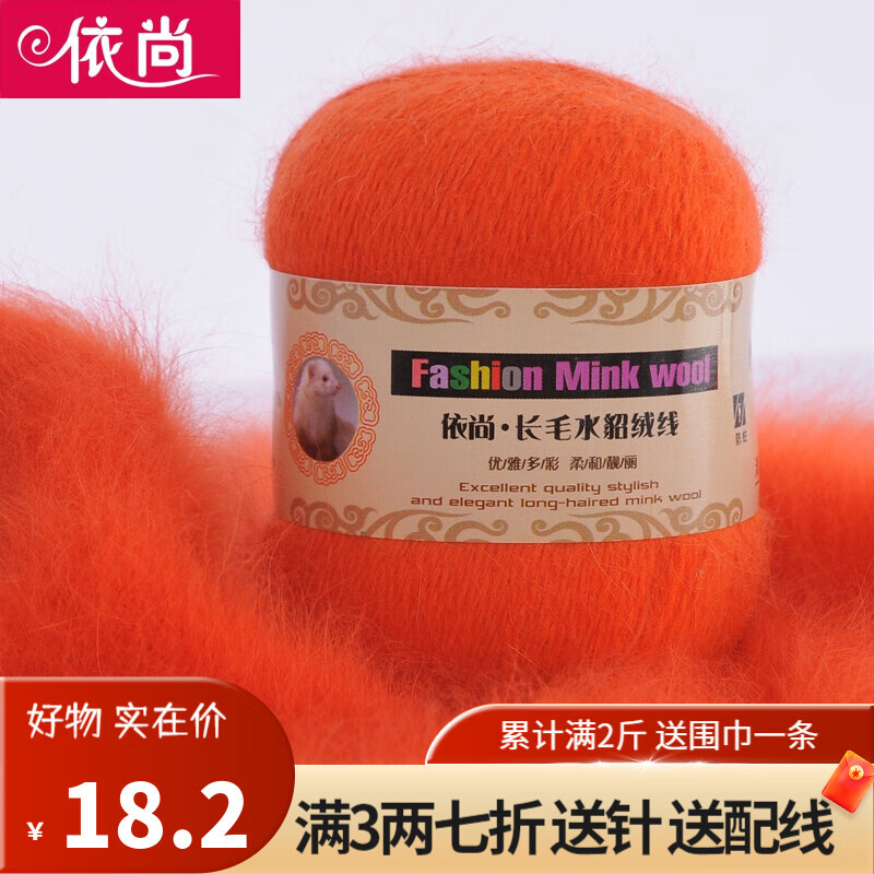 依尚长毛水貂绒毛线羊绒线围巾毛线团粗毛线编织婴儿用毛线球手编中粗 橘红色