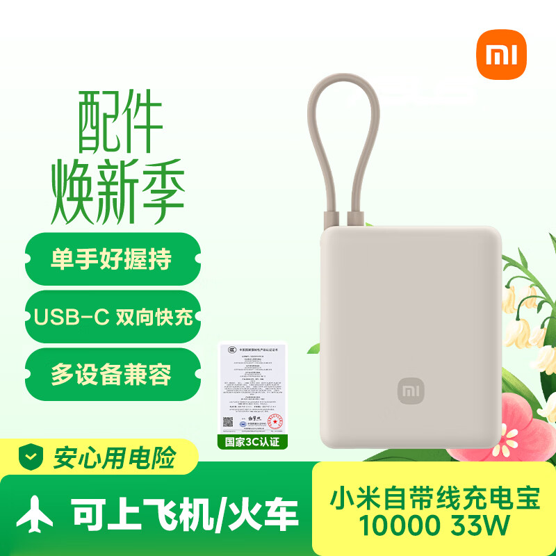 小米(MI)3C认证充电宝自带线10000 33W 浅咖色适用小米华为荣耀手机可上飞机/火车移动户外储能电源