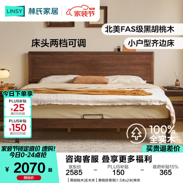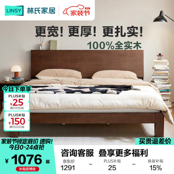 林氏家居 复古中古风胡桃色全实木床排骨架1.51.8米可选大床小满系列PK20A 全实木床 1.5米x2米
