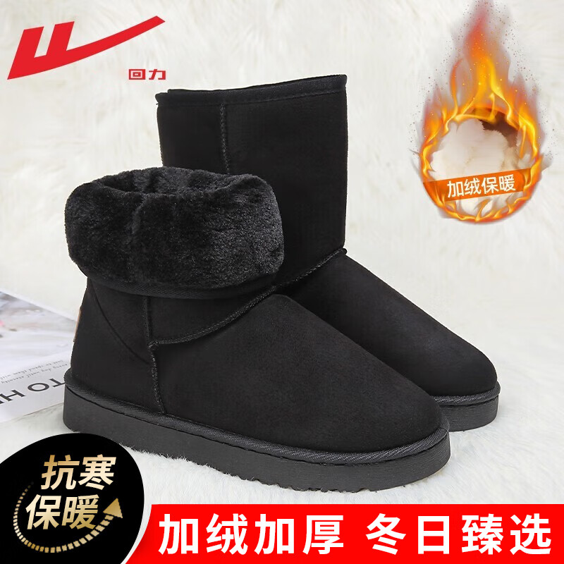 回力雪地靴女冬季新款皮毛一体中筒棉靴女士休闲加绒加厚保暖棉鞋子女 黑色 【中筒款】 36