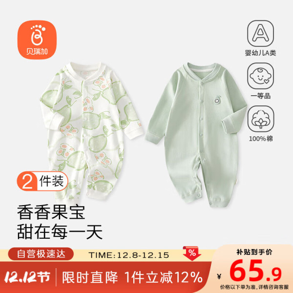 Babyprints 贝瑞加(Babyprints)婴儿连体衣2件装男女宝宝纯棉衣服柔软爬服家居内衣四季哈衣 绿73