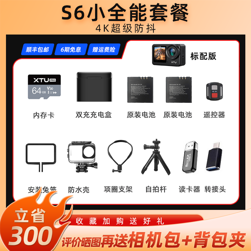 XTU骁途S6运动相机4K超级防抖摩托车头盔记录仪户外钓鱼相机自行车Vlog运动摄像机 标配 64G内存卡