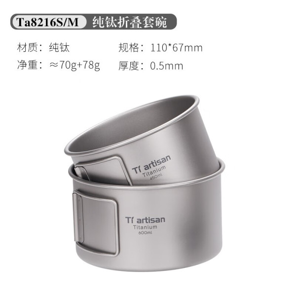 Ti artisan 钛工匠纯钛单人钛碗隔热防烫户外套装野营野餐露营饭盒便携餐具 Ta8216s+m折叠手柄450ml+600ml