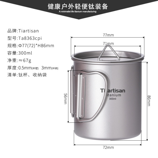 Ti artisan 钛工匠户外钛杯纯钛水杯露营便携式茶杯咖啡杯子钛合金折叠水杯子 斜柄钛杯300ml(平盖款)