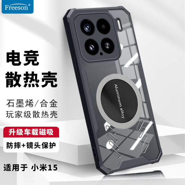 Freeson 适用小米15 散热手机壳保护套镜头全包防摔四角防撞简约透明 金属磁吸适配散热器 黑色
