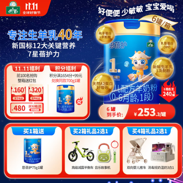 御宝 YB 恩蓓护婴儿羊奶粉纯羊奶生羊乳A2乳铁蛋白新国标送试用低敏自护力 1段 0-6个月 700g 6罐 1件