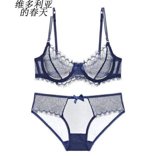 维多利亚的春天 旗舰新品欧美半透明薄款内衣聚拢诱惑性感蕾丝女士文胸套装 蓝色 70C