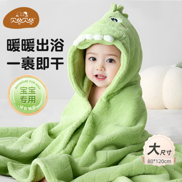 贝谷贝谷 儿童浴巾洗澡新生婴儿带帽浴袍珊瑚绒加厚软吸水速A类加厚款 绿色小恐龙 礼袋装 120*80cm