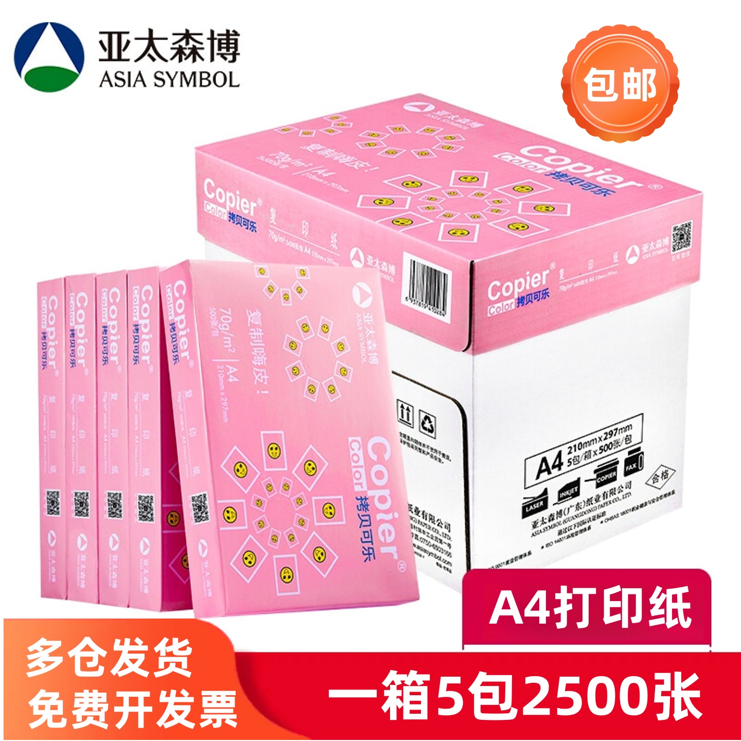 亚太森博 拷贝可乐A4纸 打印复印纸70g 80克 500张/包 5包/箱白纸