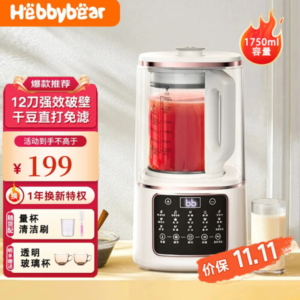 海贝熊(Hebbybear)德国1.75升低音破壁机家用豆浆机免洗自清洁全自动小型辅食机预约加热早餐机 1.5L【16叶刀头+12小时预约】