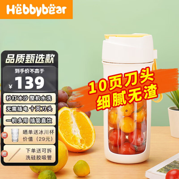 海贝熊(Hebbybear) 榨汁机10叶刀头家用小型便携式多功能榨果汁机迷你搅拌榨汁杯 白色