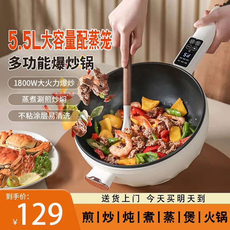 海贝熊(Hebbybear)德国 电炒锅多功能炒菜一体大功率不粘锅家用宿舍电火锅智能温控电热锅 5.5L 【智能】配蒸笼 1500w
