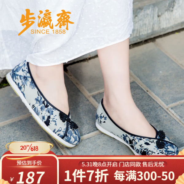 步瀛斋老北京布鞋女民族风 手工千层底 绣花汉服鞋古风时尚休闲平底单鞋 蓝色 35