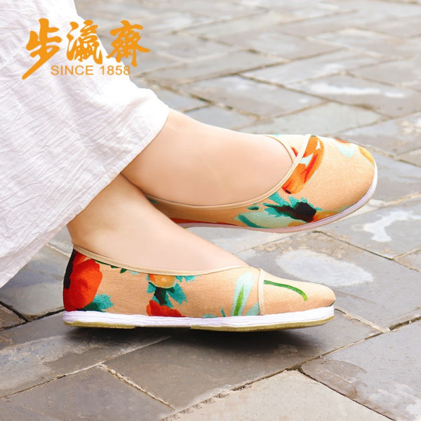 步瀛斋 老北京布鞋女 传统布鞋 手工千层底 浅口单鞋民族风印花单鞋 黄色 36