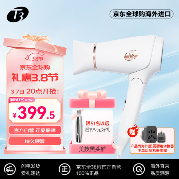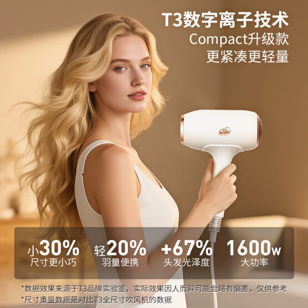 T3 美国热销 compact 便携吹风机 可折叠电吹风 冷风锁定 家用 出差 旅行 节日礼物