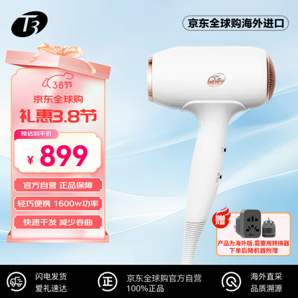 T3 美国畅销 Fit 电吹风家用高速吹风机 大功率速干护发 便携负离子吹风机 生日礼物(赠转化插头)