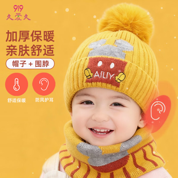 久爱久 婴儿帽子冬围巾两件套萌宠暖护宝宝加绒护耳帽1-5岁男女童黄色F52