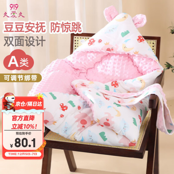 久爱久 新生儿抱被冬季加厚纯棉豆豆绒婴儿睡袋宝宝襁褓包巾包被粉90*90