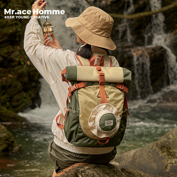 Mr.ace Homme 轻便防水大容量露营包旅行书包运动户外背包男 山系绿+杏帽子