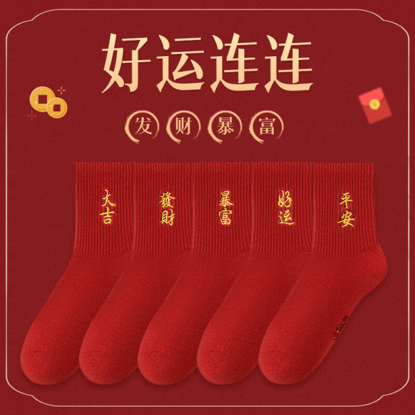在水蓉 红袜子龙本命年男女士结婚情侣喜庆袜中筒新年鸿运袜平安大红袜 红袜-好运系列5双