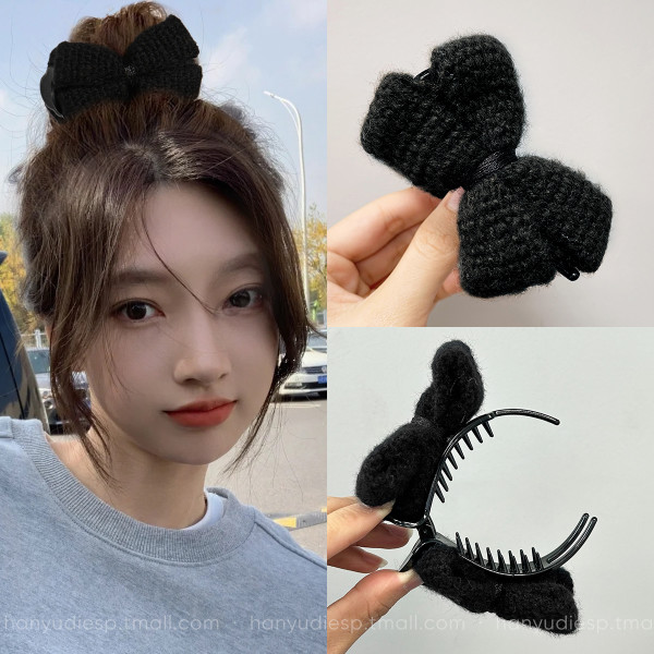 宋仁何同款针织毛线黑色蝴蝶结头饰发夹女丸子头抓夹盘发神器发饰