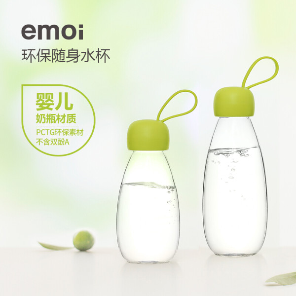emoi 环保随身瓶 学生儿童便携塑料水杯可爱防漏随手杯透明带盖H1140/H1141 透明绿360ml