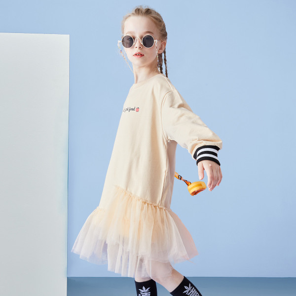 Puffykids 泡芙宝 女童连衣裙春秋款中大童网纱长袖圆领宽松洋气百搭裙子