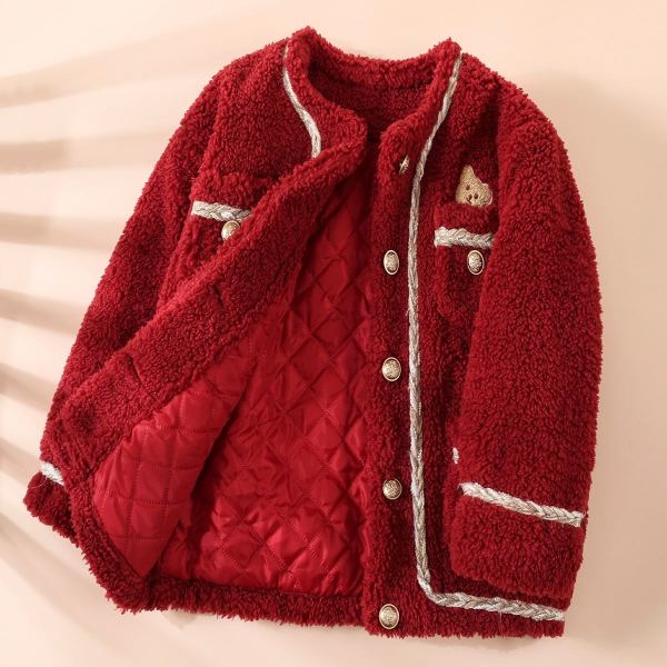 Puffykids 泡芙宝 女童小香风外套22年新款中大童仿羊羔毛圣诞款上衣保暖加厚外套