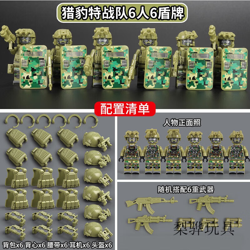 乐高高军事人仔迷彩幽灵特种兵特警人仔装备配件悍马车拼装积木 猎豹特战队6款 6盾牌