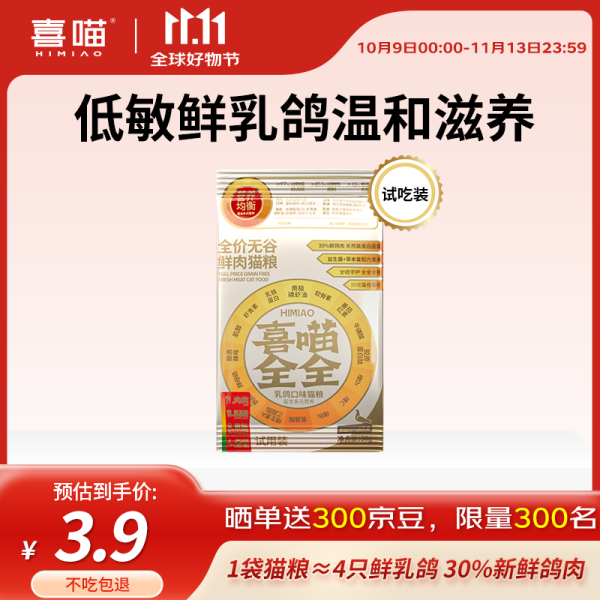 移动端、京东百亿补贴:喜喵 金全全鲜乳鸽生骨肉冻干全价无谷鲜肉成猫幼猫试吃干粮50g*1