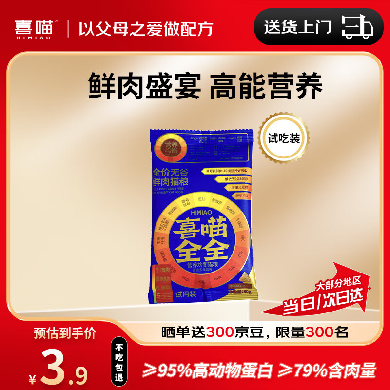 喜喵蓝全全鲜鸡肉三文鱼无谷高蛋白全价幼猫成猫干粮试吃装50g*1