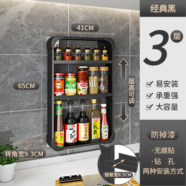 诗诺雅 厨房置物架壁挂调料架免打孔多层调味品盒挂架收纳架 黑色三层