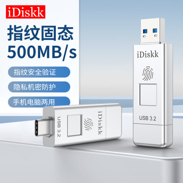 iDiskk指纹识别加密固态U盘 USB3.2 双接口手机电脑TYPE-C两用 商业创作机密隐私保护 高速读写500MB/s