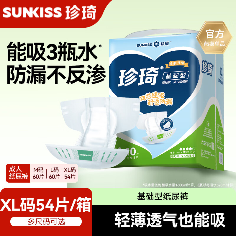 珍琦成人纸尿裤夜用型54片MLXL码老人尿不湿加厚纸尿布大吸量