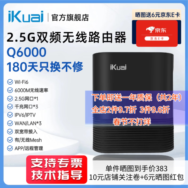 iKuai 爱快 IK-Q6000 双频6000M 家用千兆无线路由器 Wi-Fi 6 黑色