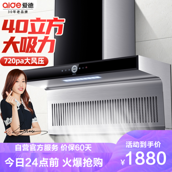 爱德(aide)新品变频大吸力40立方侧吸式油烟机 不锈钢7字型排油烟机单烟机免拆洗 厨房家用排烟机 DD02 自行安装