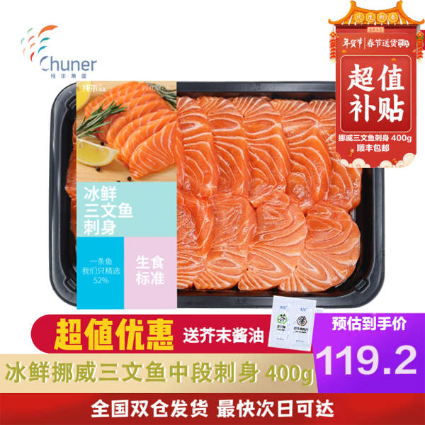 纯尔【源头直发】冰鲜挪威三文鱼切片刺身级中段400g大西洋鲑生鱼片