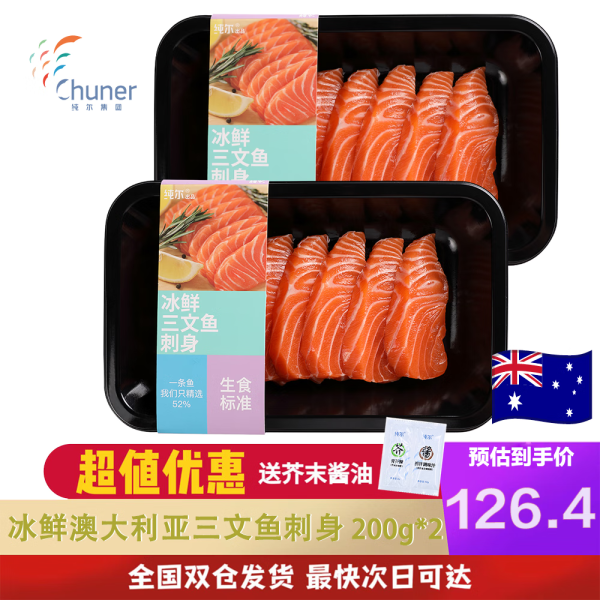纯尔【源头直发】冰鲜澳大利亚三文鱼200g*2 切片 可生食刺身生鱼片