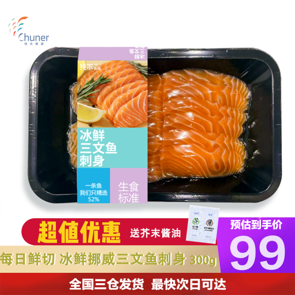 纯尔【源头直发】冰鲜挪威三文鱼300g切片刺身中段即食 每日鲜切