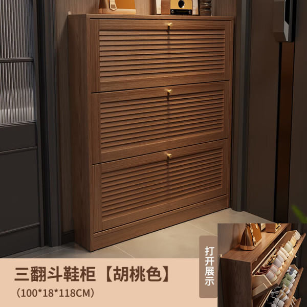 冬木实木鞋柜18cm家用翻斗式门厅柜超薄玄关鞋柜入户门收纳储物柜 三层翻斗鞋柜-胡桃色100*18*118