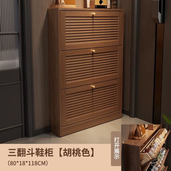 冬木实木鞋柜18cm家用翻斗式门厅柜超薄玄关鞋柜入户门收纳储物柜 三层翻斗鞋柜-胡桃色80*18*118