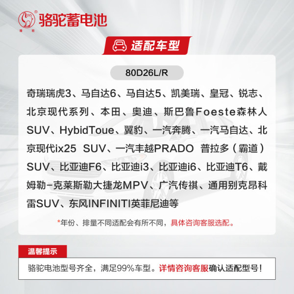 骆驼蓄电池80D26l丰田凯美瑞索纳塔荣放马自达6博瑞起亚汽车电瓶