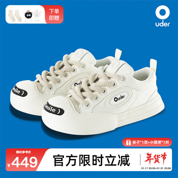 OUDER smiler开口笑帆布鞋 低帮增高厚底大头鞋圆头小白鞋 男女同款 白色 37