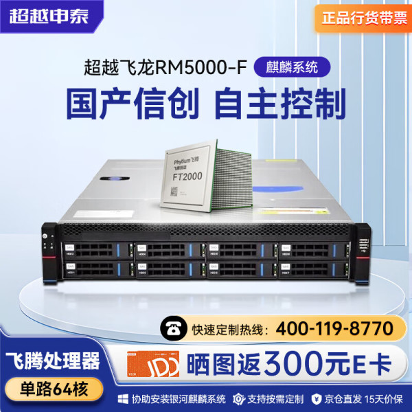 超越申泰飞龙RM5000-F国产信创服务器自主可控FT2000 64核/64G/2*512G 4*2.4T/2G/正版银河麒麟V10国防版
