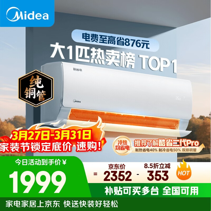 美的空调 酷省电 大1匹 新一级能效变频冷暖卧室 纯铜管 卧室节能空调挂机国家补贴KFR-26GW/N8KS1-1