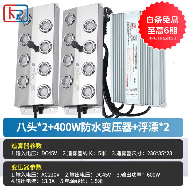 KR超声波雾化器 雾化板 大雾量鱼池盆景水雾喷雾器水池假山烟雾器园林造景雾化加湿器 一拖二【八头雾化器*2 防水电源 浮漂】