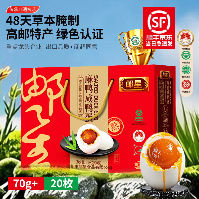 邮星咸鸭蛋高邮特产20枚*60g礼盒散养流油麻鸭咸蛋端午节鸭蛋